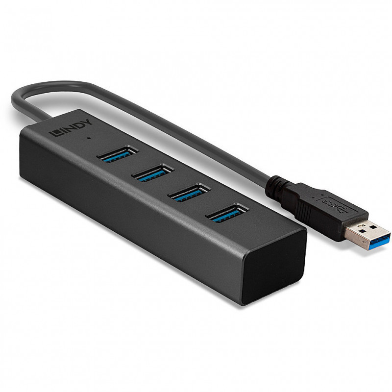 "Lindy 4 Port USB 3.0 Hub. Host interface: USB 3.2 Gen 1 (3.1 Gen 1) Type-A, Hub interfaces: USB 3.2 Gen 1 (3.1 Gen 1) Type-A. Data transfer rate: 5000 Mbit/s, Product colour: Black, Housing material: Aluminium, Plastic. Power supply type: USB. Width: 103 mm, Depth: 26 mm, Height: 18 mm. Package width: 174 mm, Package depth: 20 mm, Package height: 194 mm"\n"The Lindy 4 Port USB 3.0 Hub provides 4 USB Type A SuperSpeed ports for connecting USB peripherals to a USB Type A equipped computer. Capable of data transfer speeds of up to 5Gbps, the hub is also backwards compatible with USB 2.0 and 1.1.