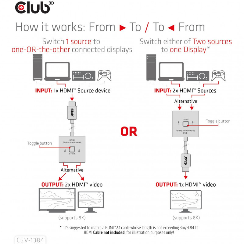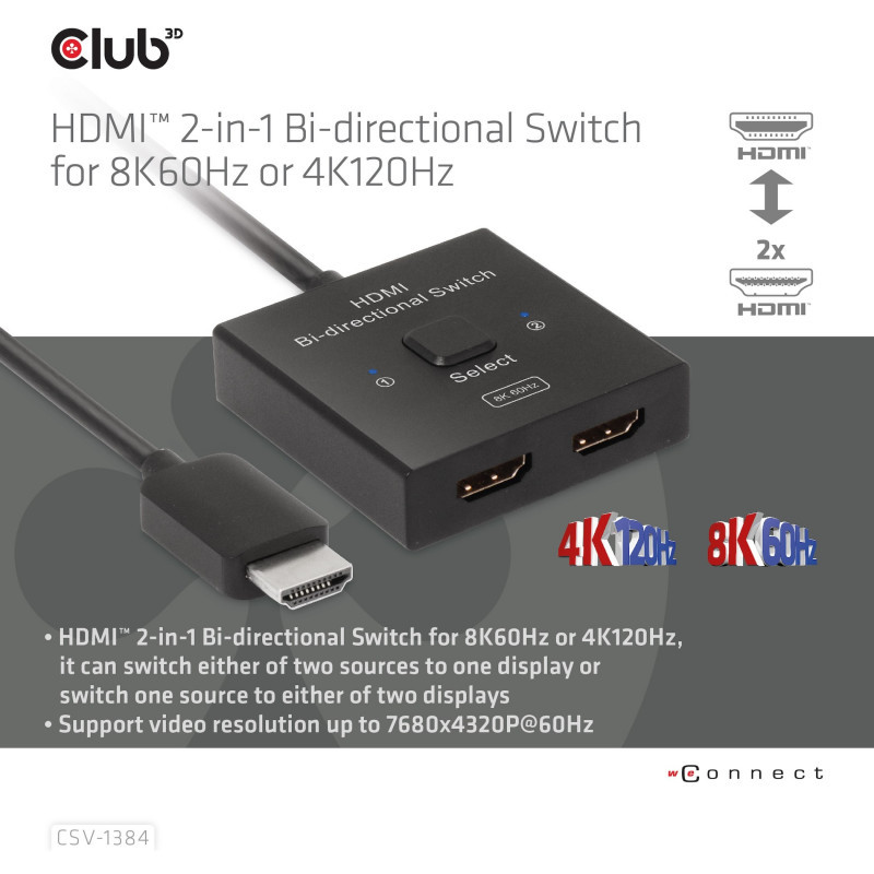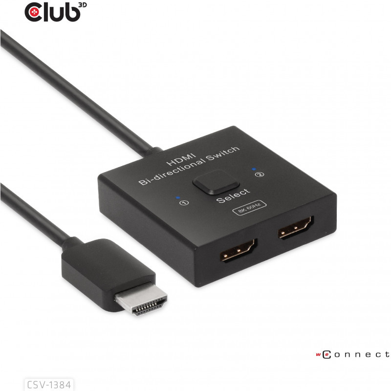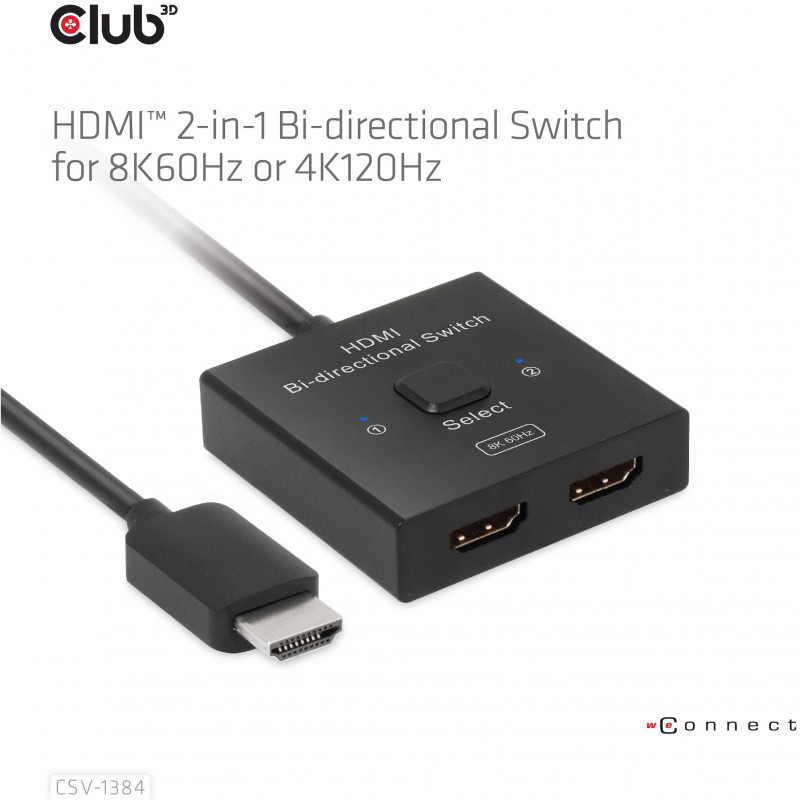 "CLUB3D HDMI 2-in-1 Bi-directional Switch for 8K60Hz or 4K120Hz. Paper/cardboard packaging weight: 45 g, Plastic packaging weight: 2 g. Harmonized System (HS) code: 8473 3020"\n"The Club 3D CSV-1384 is a HDMI™ 2-in-1 Bi-directional Switch for 8K60Hz or 4K120Hz. It can switch either of two sources to one display or switch one source to either of two displays. Press the switch button to select channel 1 or channel 2. With a piece of 0.5m / 1.64 ft length fixed HDMI™ cable (pigtail), this Switch not only reduces cost but also saves time for customers. This kind of HDMI™ Switcher routes high definition video (in multiple resolutions and up to 8K60Hz) and digital audio from the sources to display units."