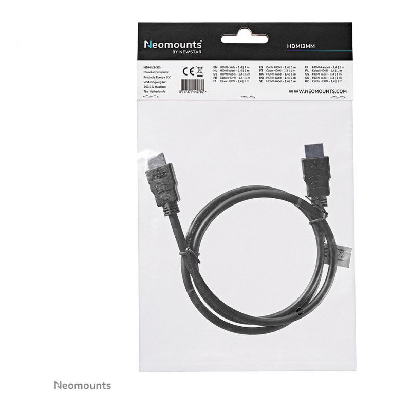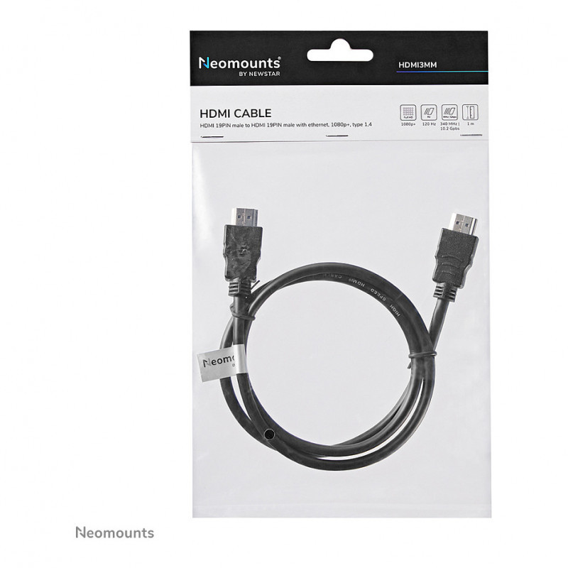 "Neomounts HDMI3MM HDMI cable - 1 metres. Cable length: 1 m, Connector 1: HDMI Type A (Standard), Connector 1 gender: Male, Connector 2: HDMI Type A (Standard), Connector 2 gender: Male, HDMI version: 1.3, Data transfer rate: 10.2 Gbit/s, Product colour: Black"\n"This Neomounts high quality 1 meter HDMI cable, model HDMI3MM, features 2 HDMI male connectors, providing a direct link between HDMI devices such as Blu-Ray players, HDTVs, DVD Players, stereo receivers and more.