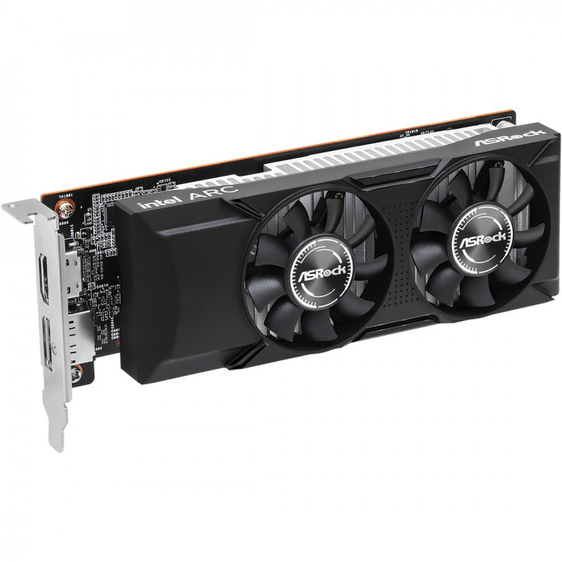 "Asrock Intel Arc A310 Low Profile 4GB. Graphics processor family: Intel, Graphics processor: Arc A310, Processor frequency: 2000 MHz. Discrete graphics card memory: 4 GB, Graphics card memory type: GDDR6, Memory bus: 64 bit. Maximum resolution: 7680 x 4320 pixels. DirectX version: 12 Ultimate, OpenGL version: 4.6. Interface type: PCI Express x8 4.0. Cooling type: Active, Number of fans: 2 fan(s)"\n"Low Profile Design