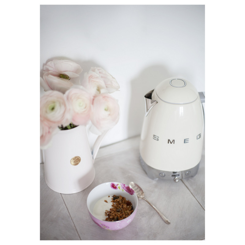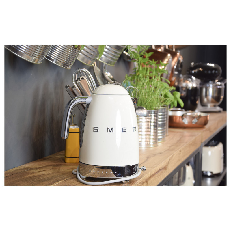 "Smeg 50's Style Kettles KLF04CREU Cream. Water tank capacity: 1.7 L. Power: 2400 W. Product colour: Cream, Housing material: Stainless steel, Adjustable thermostat, Water level indicator, Overheat protection. Cordless. Keep warm function, Filtering"\n"Smeg's iconic retro design offers a pop of colour and a premium enamelled finish. The KLF04 variable temperature kettle allows you to choose from 7 set temperatures ranging from 50°C to 100°C. With a generous capacity of 1.7 litres, you can make up to 7 cups of your favourite tea whether it be breakfast, green, or fruit. The keep warm button allows you to keep the water at your selected temperature for up to 20 minutes, ensuring the perfect beverage is always to hand.