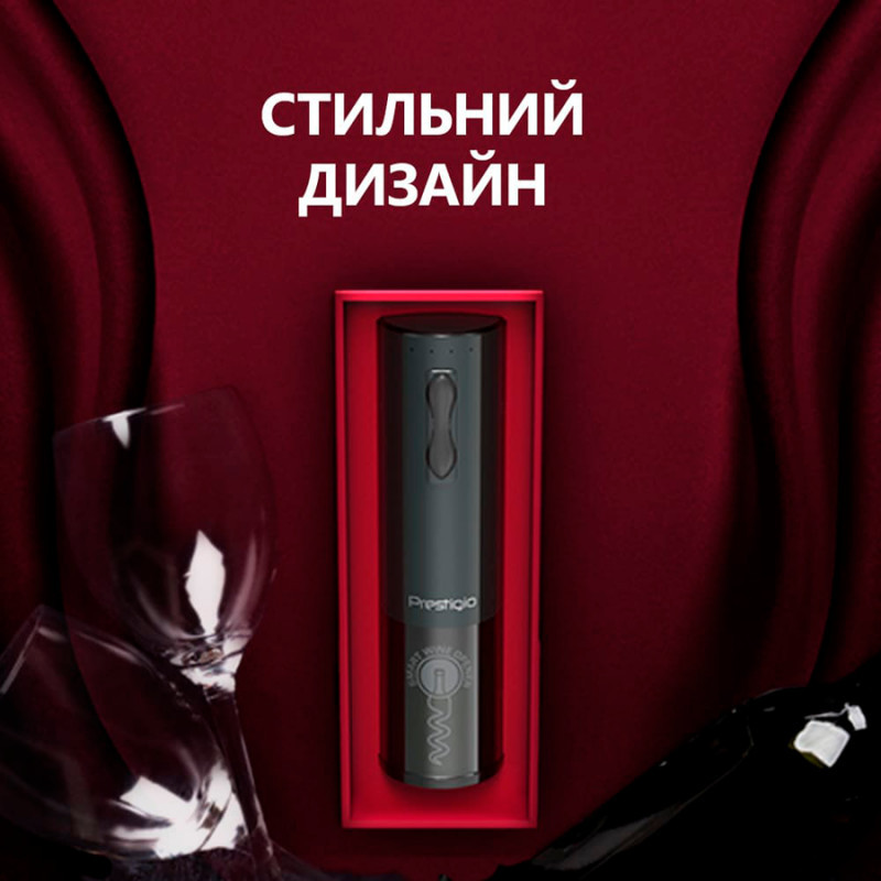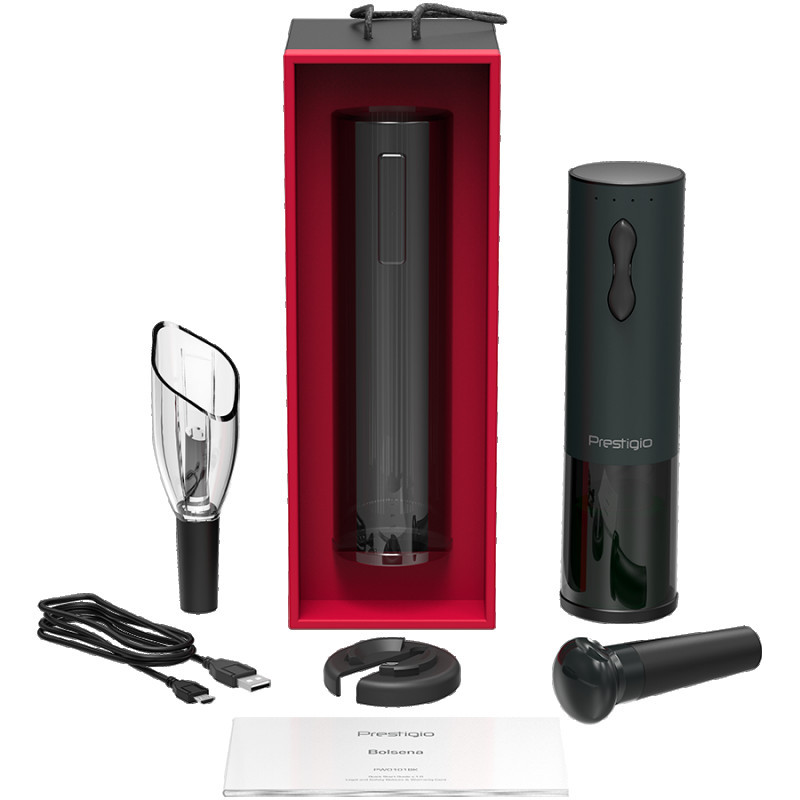 Bolsena Electric Wine Opener“ – modernus elektrinis vyno atidarytuvas su Prestigio logotipu, skirtas lengvam ir greitam vyno butelių atidarymui. Komplekte yra vyno aeratorius, kuris pagerina gėrimo skonį, bei vakuuminis butelių konservatorius, padedantis išlaikyti vyną šviežią ilgesnį laiką. Juodos spalvos dizainas suteikia elegancijos ir dera prie bet kurios virtuvės ar baro aplinkos. Patogus, greitas ir stilingas sprendimas vyno mėgėjams.
