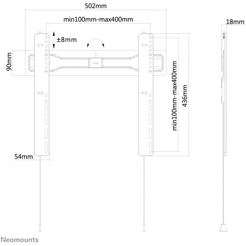 "Neomounts LED-W400BLACK TV mount wall 32-55"" - ultra-flat. Maximum weight capacity: 35 kg, Minimum screen size: 81.3 cm (32""), Maximum screen size: 139.7 cm (55""), Minimum VESA mount: 100 x 100 mm, Maximum VESA mount: 400 x 400 mm. Distance to the wall (max): 1.8 cm. Product colour: Black"\n"The Neomounts wall mount, model LED-W400BLACK is a fixed wall mount for flat screens up to 55"". This mount is a great choice when you want the ultimate viewing flexibility with your flat screen. Depth of this mount is 1,8 centimetres.