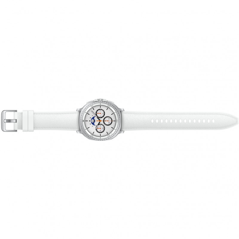 "Samsung Galaxy Watch8 Classic. Display diagonal: 3.3 cm (1.3""), Display technology: AMOLED, Display resolution: 438 x 438 pixels, Touchscreen. RAM capacity: 2000 MB, Flash memory: 64 GB. Wi-Fi. GPS (satellite). Battery capacity: 445 mAh. Weight: 63.5 g. Band colour: White, Band size: One Size. Operating system installed: Wear OS"\n
