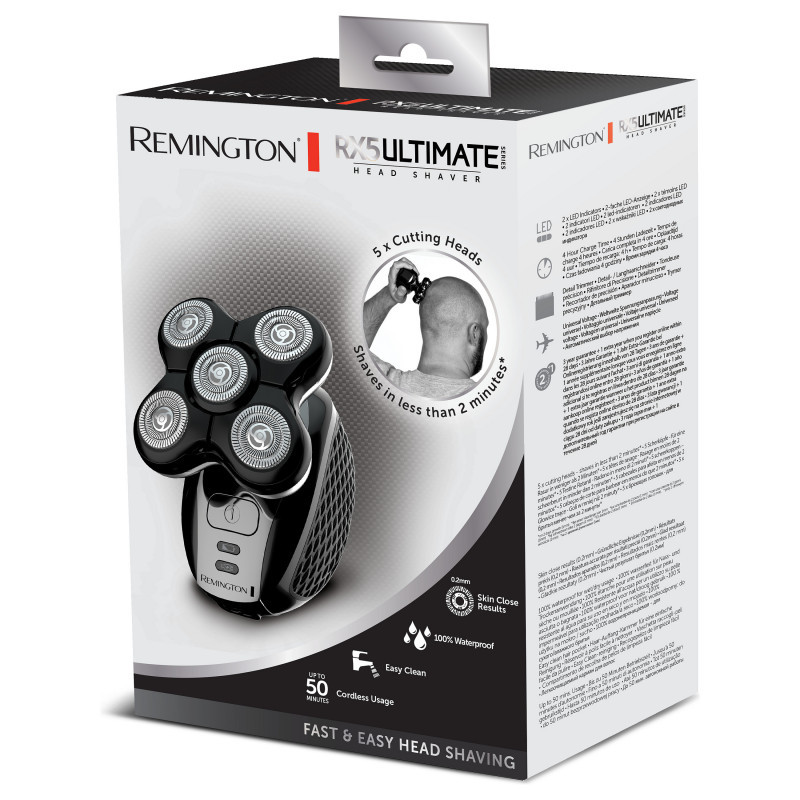"Remington XR1500. Product colour: Black, Body grooming attachments: Head shaver, Minimum hair length: 0.2 mm. Power source: Battery, Operating time: 50 min, Battery recharge time: 2 h. Package type: Box"\n"The Ultimate Series RX5 Head Shaver delivers skin-close results in less than 2-minutes with 5 Cutting Heads, for fast and easy head shaving.