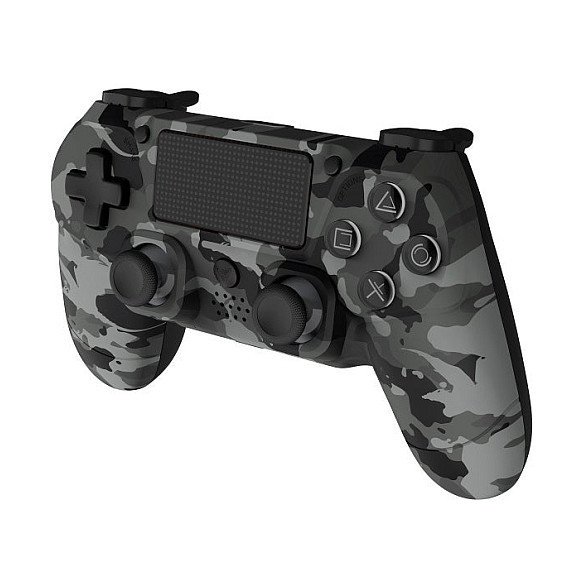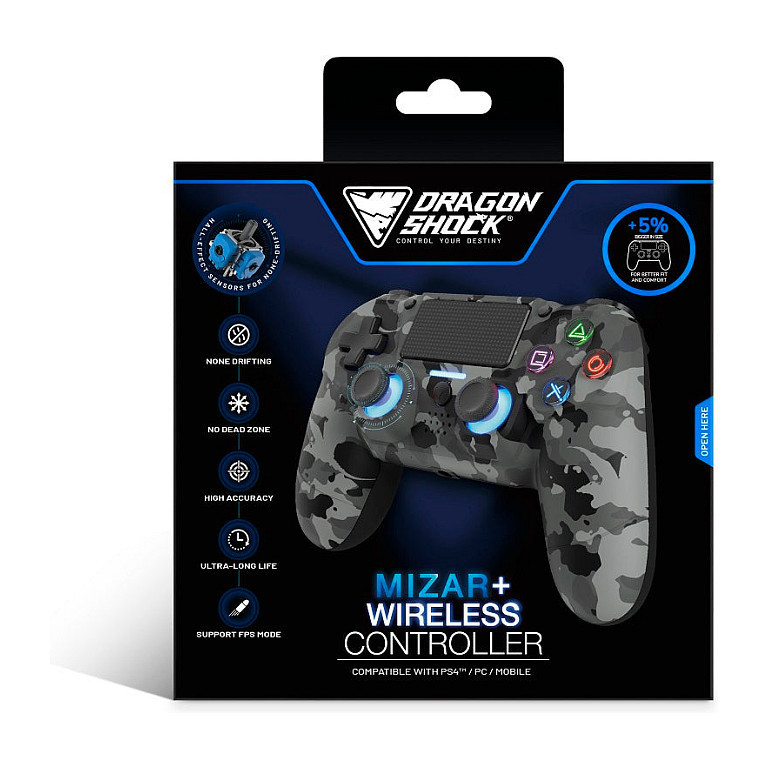 "Dragonshock Mizar+. Device type: Gamepad, Gaming platforms supported: PC, PlayStation 4, Android, Gaming control function buttons: D-pad, Home button, Turbo button, Reset button, Options button, Share button. Connectivity technology: Wireless, Device interface: Bluetooth, USB connector type: USB Type-C. Product colour: Black, Grey, Camouflage, Cable length: 2 m. Power source: Battery, Battery type: Built-in, Battery technology: Lithium-Ion (Li-Ion). Weight: 208 g"\n"Gear up for total control. The MIZAR+ Full Grey Camo blends tactical design with elite performance, putting next-gen precision in your hands for PS4™, PC, and Android.